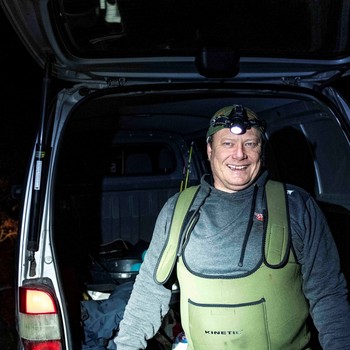Utstyrt med hodelykt og en helt vanlig fiskestang, håper han å få fast fisk med en bitte liten reke som agn.