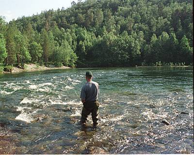 Laksen går på elva i juni. Beste fisketid er slutten av juli.