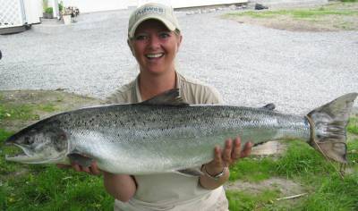Bim Elisabeth Jobsen ble kåret til Fiskeguidens lakseprinsesse 2005. Her er hun med sesongens første laks i Drammenselva, en flott hannlaks på 10,1 kilo! I 2004 tok hun en på 11 kilo og året før en på 12,1!