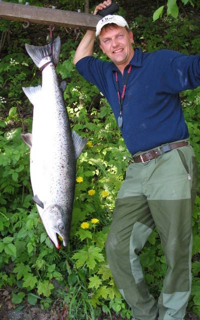 Ragnar Apenæs tok sin kjempelaks på tredje kastet med sin splitter nye stang, på tubeflue og søkke i blå sone vest. Laksen viste seg å være 120 cm lang og veide nøyaktig 20,1 kilo.