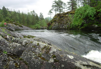 Der Lachs zieht weiter durch den 300 Meter langen Fløsjøen zum Trollwasserfall. Direkt in der Fallrinne unterhalb der Brücke sind ein paar tiefere Stellen, wo des Öfteren einige schöne Lachse stehen, aber das Problem von der Fleckenseite aus ist es, den Fang zu bergen.