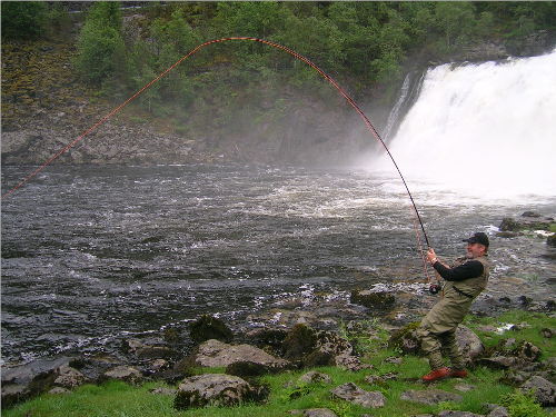 Ein goldener Augenblick! Foto: Bjørn Sandnes.Aber nicht alle Lachse erleben den Höhepunkt ihres Lebens, begehrt unter den Sportanglern wie mich. Gut, daß einige von uns den Fisch wieder zurücksetzen, den sie gefangen haben, dachte ich gerade. Genau als es passiert, der Großlachs schnappt sich meine Fliege. Ich lasse die lose Schlaufe fallen und hebe danach die Angel an. Er sitzt. Ich Zittre. Mir läuft es vor Freude und Anspannung kalt den Rücken herunter. Zu dem Sausen und dem kühlenden Wind des Wasserfalls erlebe ich den ersten goldenen Augenblick des Sommers. Zwischen den Wildblumen, Bergmulden und üppigem Birkenwald liegt der mächtige Großlachs. Mit einem „Blue Charm“ im Mundwinkel findet er seinen Tot in dieser Pracht.