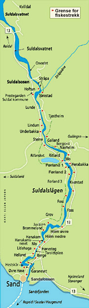 Variert, svært bra fluestrekk, men også en bra slukplass. Pris: 15.07. - 06.08. kr. 260,- / 07.08. - 30.09. kr. 360,-.Fisketid: Kl. 1800 - 1800.Kontakt Suldal Sportsfiske, Jone Moe, Suldal, N-4230 SAND, tel + 47 52 79 98 50. / tel + 47 91 60 61 61, Denne e-postadressen er beskyttet mot programmer som samler e-postadresser. Du må aktivere javaskript for å kunne se den., www.opplevsuldal.no.