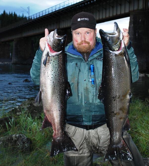 Morten Kraabøl med to storørret fra Lågen på 6,5 og 7,2 kilo.