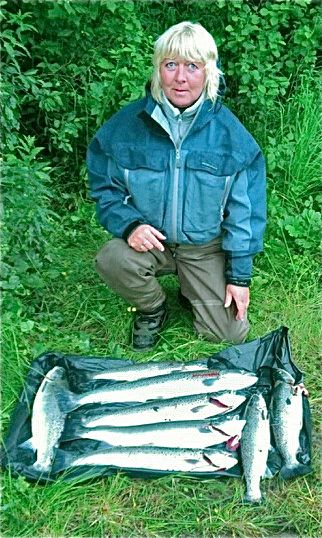 Wenche Lorentsen med sin kjempefangst som hun sammen med sin sønn Michael tok på dupp og Olsen-flua i løpet av et par timer 16.juli 2012.