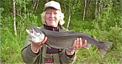 Wenche Lorentsen med en sjøørret på 3,3 kilo tatt på dupp og flue.