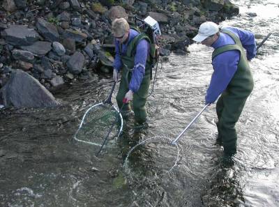 Oppfisking i sideelv til Røssåga ved rotenonbehandlingen 2003-2004. Foto: Lars Sæter