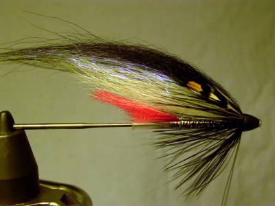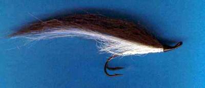 Geir viser oss favorittflua si, den svarte og hvite tubeflua Angel Shadow. Han har flere varianter. Fargene på fluene i Beiarelva er stort sett de samme som benyttes på fluer i Trøndelag, som grønn og svart, oransje og svart, og rød og svart.