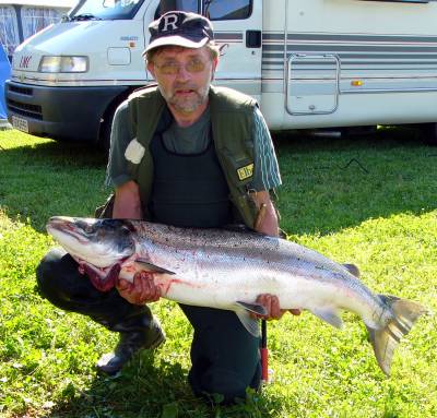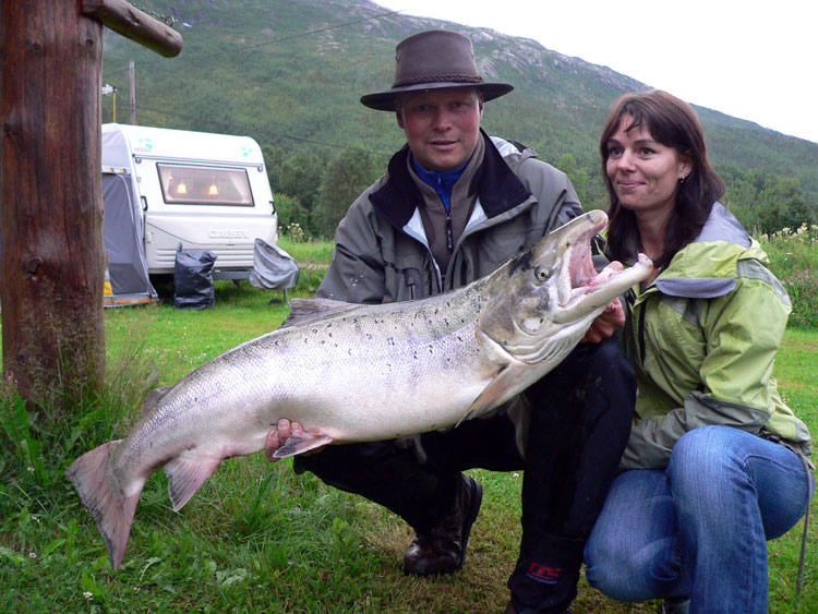 Noen er mer heldig enn andre. Robert Brodersen måtte avslutte fiske i 2007 ved å fylle kvoten sin med 5 laks - den største på 15.kilo. Fiskerenka Renate er vel så glad - for å få gubben tilbake!