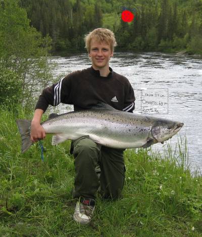 Det ble en pinsedag hele familien vil huske for bestandig. 12 lakser ble dagsfangsten. Dessuten mistet vi en som i hvertfall var over 10 kilo, sier Simen. Og den røde rappalaen må være god. 7 av laksene ble tatt på den, legger han til.