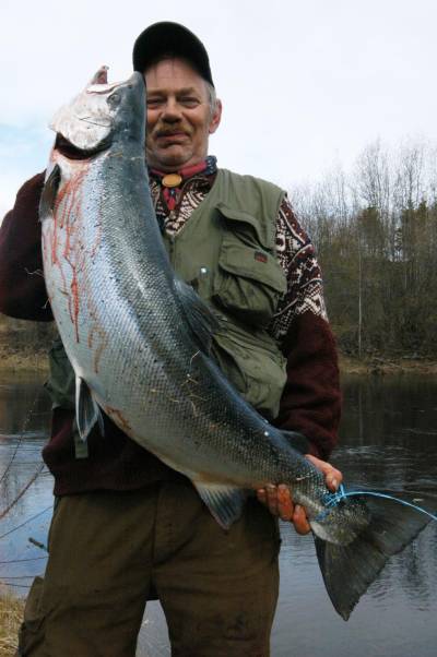 Ulltråden på markkroken blandet seg blodet fra den kraftige laksekjeven. En slik fisk hadde Tore bare drømt om. Hans tidligere rekord var bare 7 kilo!
