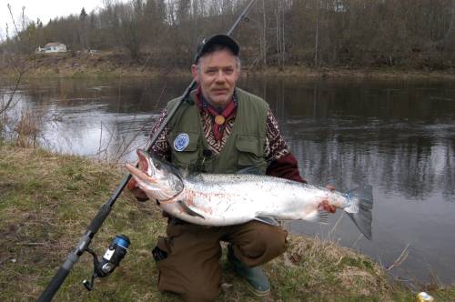 Det var to kuldegrader og snøbyger. Temperaturen i elva viste bare pluss to. Hvem kunne få laks i slikt vær? Nei, de fleste ga opp. Ingen ville få noen laks denne dagen, mente de. Bare to fiskere holdt ut. Tore Mohrsen (bildet) og Frits Løkkemo fra Namsos.