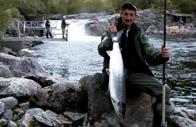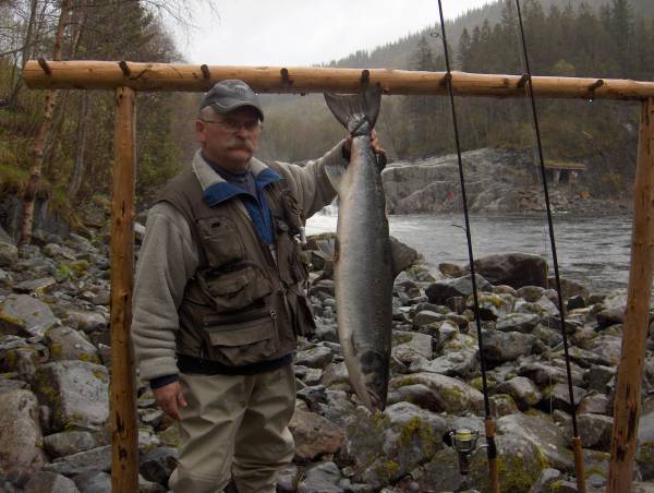 Selv om Stordalselva er en typisk smålakselv, slenger det en og annen storlaks. Lenger nede på siden vår ser du bildet av Svein Arnevik med sin 12 kilos laks.