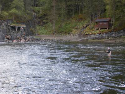Vannføringen var fin og vanntemperaturen 8 grader. Laks hoppet ved utløpet, klar til å gå opp. Været var grått, med tunge skyer og regn.