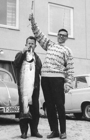 Kaare Fostervoll (til høyre) og Asbjørn Berger med en laks på 14,3 tatt i glansperioden i Rauma. Mon tro om storlaksen kommer tilbake?