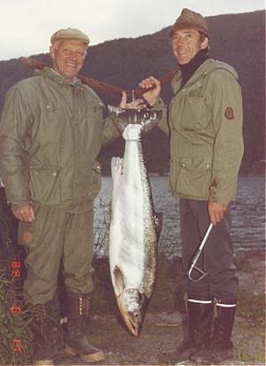 Ove Nord (til venstre) og Lars Dahle med en laks på 18 kilo tatt i Rauma før gyroen inntok elva. (Foto: H. Sødahl).