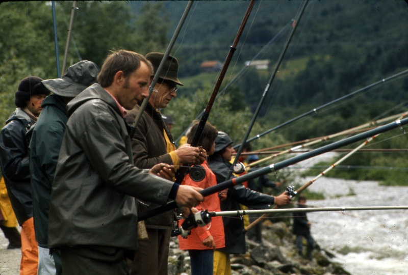 Folk fisket i kø i Bondalselva 1976. Foto:Eivind Fossheim