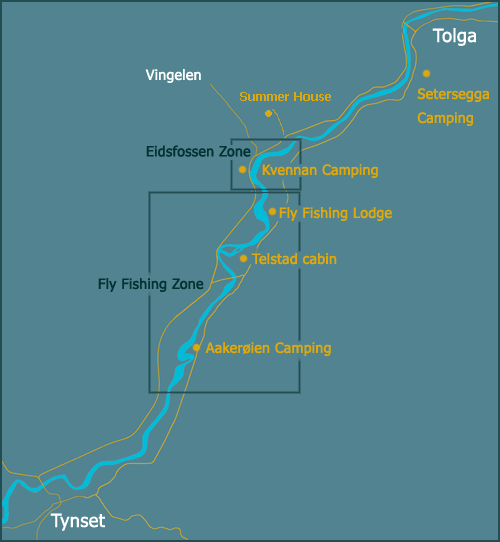 Fra Gammelbrua i Tolga til Eidsfossen og videre til like nedenfor Kvennan er priser og fiskeregler som før. Så blir det stopp for tradisjonelt fritidsfiske med mark og sluk.
