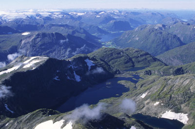 Midt på bildet opp fra venstre kommer Fossheimsdalen, med oppgang fra Skei, opp til Instebotnsvatnet. Midt på bildet nærmest kamera ligger ligger Trollebotsvatnet ( 1064 m.o.h.. Her skal det være bra med større ørret etter utsettinger på slutten av 6+0-tallet.