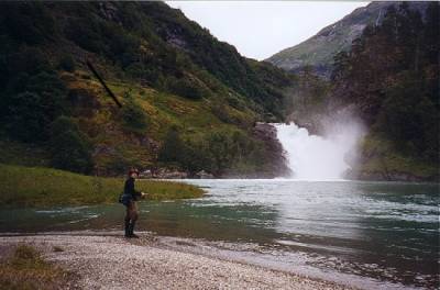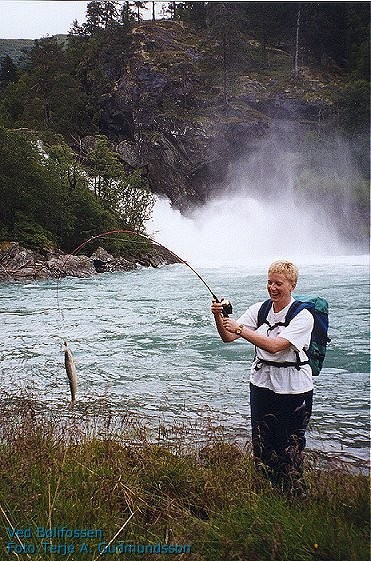 Om ikke hans rapport skulle virke tilstrekkelig inspirerende for mange av oss til å ta turen inn i fjellheimen i Sogn, legger han for sikkerhets skyld ved noen bilder fra fiskeplassene. På bildet øverst ser vi Terje i sving med stanga under under Bølifossen i Mørkridselva.