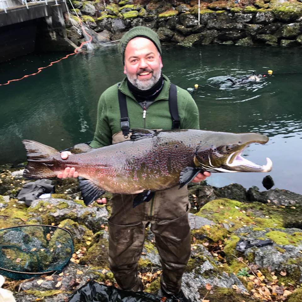 Knut Munthe Olsen med en 18 kilos hannlaks i armene. - Men der ute i skumstryket går det en som kan være over 25 kilo, han til Fiskeguiden.no