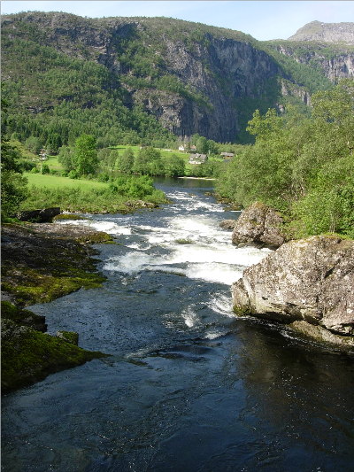 Klaus veksler med å fiske de to fossestrykene, Svardalsfossen, mellom Svardalsvatnet og Vassetevatnet, og Osafossen(bildet) mellom Vassetevatnet og Blåmannsvatnet. Begge elvestrykene er lett tilgjengelige, med fristende høler og småstryk i et frodig kulturlandskap omkranset av ville vestlandsfjell. Dette er balsam for en travel tysk forretningsmann, sier han, og kikker opp mot de viltre fossestrykene under fisketrappa. Dit våger han ikke å gå. Han minnes fremdeles sitt første dramatiske møte da han sklei ut i elva og ble reddet i siste liten av den snarrådige fiskeren med kleppen sin.