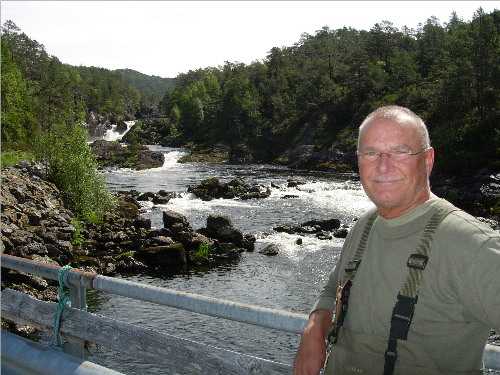 Tyskeren Klaus Bartelt ramla i Svardalsfossen og måtte trekkes i land med en klepp på sin første tur til Osenelva for 10 år siden. Siden har han fisket her hver eneste sommer i denne bortgjemte perlen på Vestlandet. Mye laks har det også blitt. 8,2 kilo er rekorden hans.