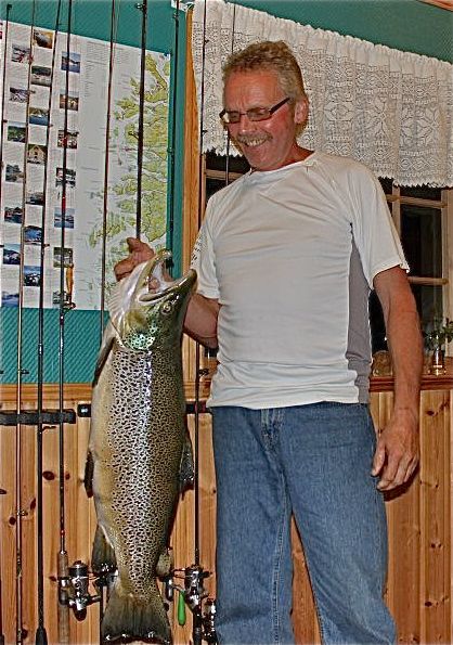 Egil klarte å unngå at fisken slapp seg nedover i elva og dermed ville vært tapt. Førte den isteden opp i stillere vann, øverst i osen, der han lot den stå mellom to store steiner mens kona løp hjem til Jølvassbu Camping etter håv.
