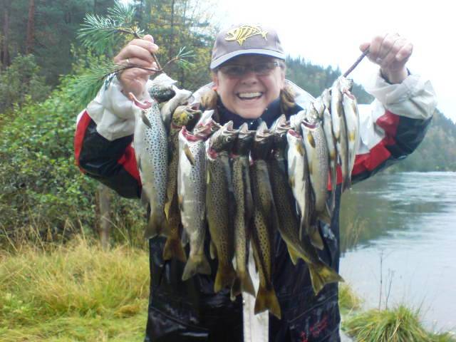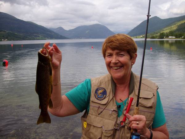 Brita Mørch med sin fangst i Jølstra. Foto: Knut Mørch.