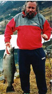 Den største ørreten som er tatt på stang fra land i Jølstyravatnet veide 12,1 kilo og ble lokket på en Sølvkroken-sluk ved innoset på Lunde, lengst øst i Jølstravatnet i 1996. Foto: Eivind Fossheim