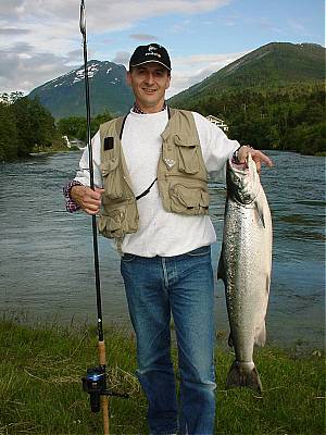I kveldinga var det fast fisk igjen. Mon tro om han ville miste den også? Duellen ble ulidelig spennende, men etter 20 minutter, sto han utpumpet, men lykkelig over en 9 kilos-laks i gresset.