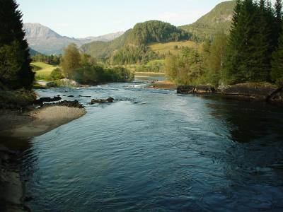 Gaularvassdraget springer ut fra Jostedalsbreen, 7 mil fra utløpet i Dalsfjorden.