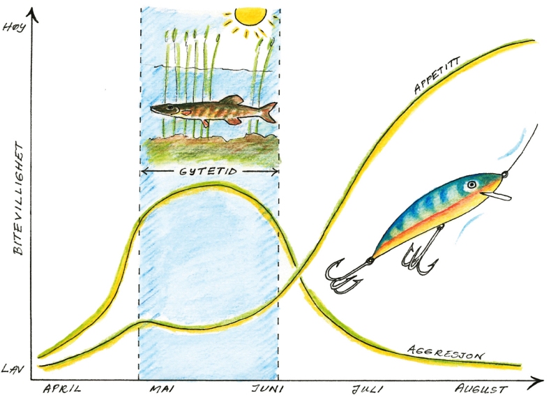 Fiskeekspertene Morten Kraabøl og Børre K. Dervo gir i sin bok "Derfor biter fisken" en fremstilling av når bitevilligheten er størst hos gjedde og storørret basert på fiskens appetitt og aggresjon til ulike tider av fiskesesongen. Det er en fin nøkkel for den som bevisst søker etter storfisken i vassdrag som Tyrifjorden, Mjøsa og Sperillen.
