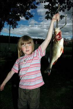 Anne Grøterud (6) fra Rud ved Vikersund (bildet til høyre)dro og dro. Først trodde hun at kroken satt fast i bunnen, men plutselig ga det etter og vips, så halte hun opp en abbor på 1,430 gram.