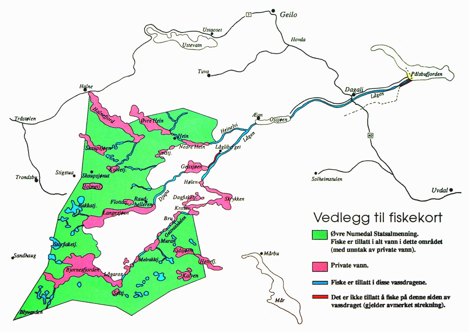 felleskortet dekker Numedal Statsallmenning og rennende vann i følgende vassdrag: Lågenvassdraget fra Lågaros til Ossjøen, Heinvassdraget fra Heintjønn til Ossjøen, Djupa og Djupestubben. Alt vann i Lågenvassdraget fra Ossjøen til Pålsbufjorden/Nore og Uvdal grense.