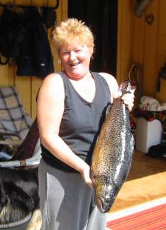 Vel tilbake ved elvekanten fastslo hun at storfisken fremdeles var på kroken. Men hvordan skulle hun få den inn i håven alene?Da var det at broren dukket opp.