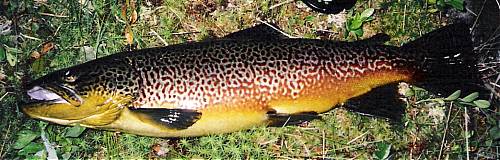 Flott fisk! Åge Jakobsen kan såvisst være stolt av sin fargerike tigerørret som falt for en Black Gnat nr. 14 på fisketuren i Otra i 2003. Nå skal ha ta en som er enda større. Han så en i fjor sommer som måtte være 3 kilo, forteller han Fiskeguiden.
