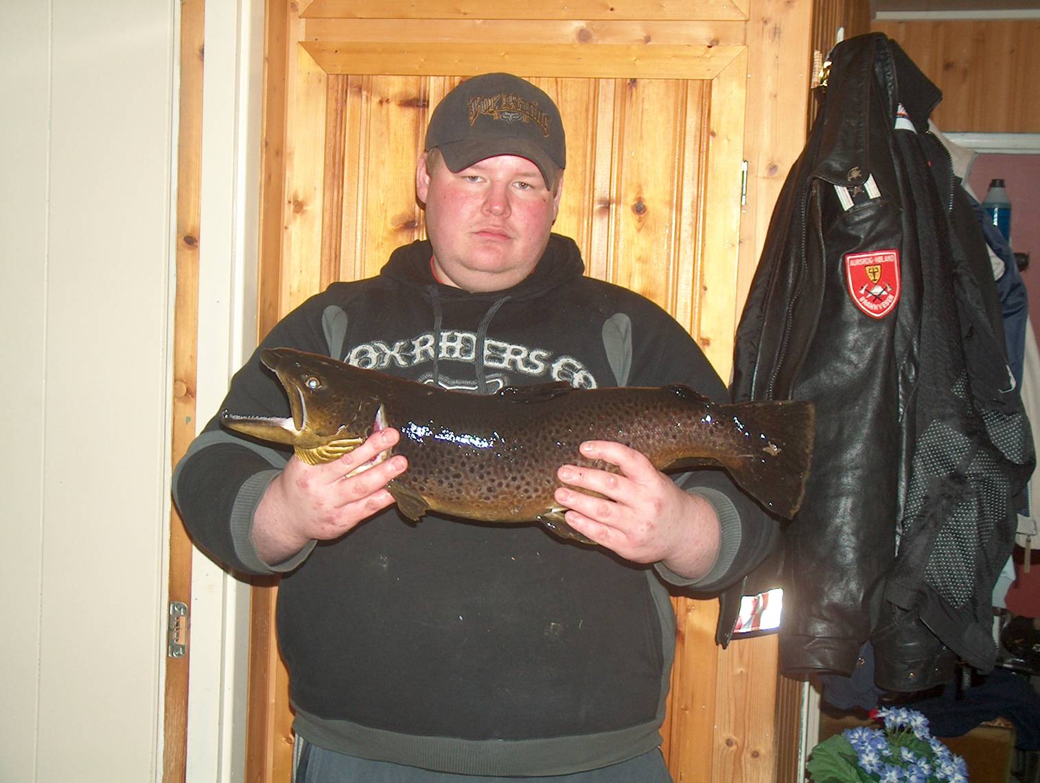 Dyntjern er et lite skogsvann som kultiveres godt. Det nytter, sier Kenneth Halvorsen, og viser oss her sin største fiskeopplevelse til nå. 3,04 kilo veide ørreten og den var 65 cm lang. Han tok den på palmermygg krok nr.16 med 0,16 mm fortom. Stangen han brukte, var en Slate spx klasse 4.