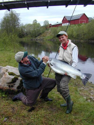 Da Trude Astrid Johnsen (30) 6.juni 2001 fikk en storlaks på 17 kilo i Bjøra, fikk hun også samboeren på kroken. Jan Harry Aasen (40) fridde der og da ved elvebredden, og fikk øyeblikkelig ja! Og det på hans 40 års dag attpå til!