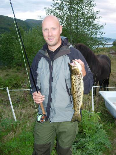 Og mens alt dette pågår kan det fiskes i elvene og vassdraget ellers benyttes på vanlig måte. På bildet til høyre har vi beviset på det. Her har prosjektmedarbeider Sigurd Hytterød tatt en fin sjøørret på flue i den nederste del av Batnfjordselva samtidig som aluminiumsbehandlingen pågikk!