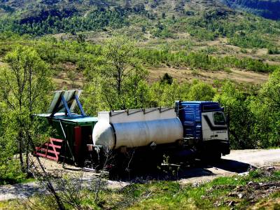nr.3: En tankbil fra Kemira fyller aluminiumsløsning på en av hoved-dosererene. Denne er plassert ved Åndalssetra ovenfor lakseførende strekning. Anlegget er drevet med solcellepaneler og kan dermed plasseres nesten hvor som helst i et vassdrag.