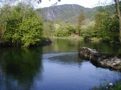 Vikedalselva er lakseførende inn til Låkafoss, ei mils vei fra sjøen og inn Vikedalsdalen.