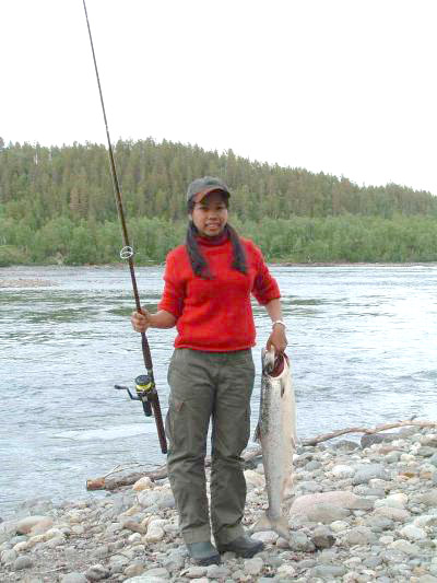 Jaroonsri er thai-jente, nå ekte norsk laksefisker, bosatt i Elverum. Rune Lien var minst like stolt over samboerens fiskelykke. Sønnen Elias på 7 mnd får nok høre om denne fiskehistorien mange ganger når han blir stor nok til å forstå hva de opplevde sammen i Målselva. Kanskje er heller ikke laksen lenger bare 6 kilo. Slike rugger har en tendens til å legge på seg med tiden!