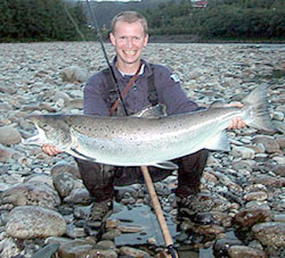 Knut Vidar Aakerøy fra Brønnøysund dro i land en laks på 19,1 kilo på mark på Røttersmo-valdet i Bjøra i natt, årets største til nå (Foto: Sigvard Hallstedt). Samtidig meldes det om en god start på fiske i andre elver som ble åpnet i natt. Svenske Meta Spors ( bilde nr.2) landet i formiddag sin laks på 11,7 kilo i Svarthølen på Støren. Det viser at storlaksen for lengst har gått Gaulfossen og at det allerede nå er laks på plass langt oppover i Gaula.