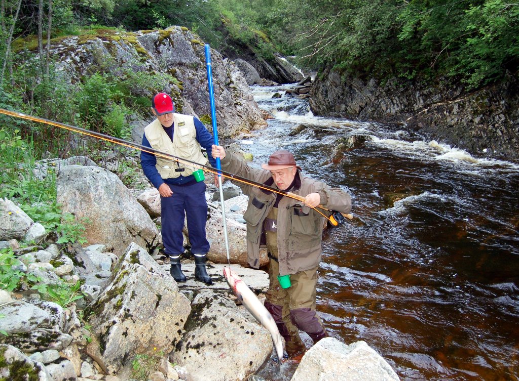 Stanga ble nesten revet ut av hendene til Paul Skarsvåg da storlaksen satte kjeften i marktugga og satte utfor Sagfossen i Bergselva i Snillfjord i går kveld. Duellen gikk og over stokk og stein nedover elva i halvannen time før Paul fikk satt kleppen i den og strukket årets første laks på land. Den sølvblanke torpedoen veide 10 kilol.