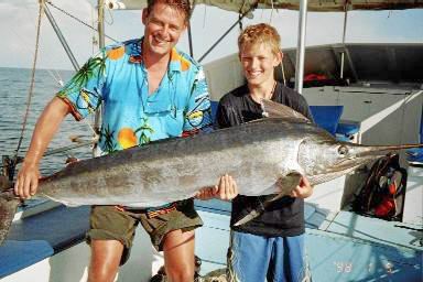De opplevde også et kjempefiske. De fikk en wahoo på 10 kilo (øverste bildet), men også langt større eksemplarer av havets storvilt. En spesiell opplevelse for Tore og Andreas Flåten var det å få på kroken en black marlin (nederste bildet) på 50 - 60 kilo, som etter luftige sprang og kraftige utras, ble kleppet i fra båten helt etter boka.I tillegg fikk de en mengde råsterke tuna, heter det i gladmeldingen.