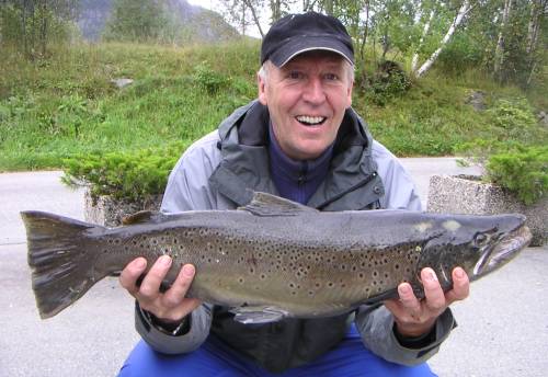 Leif Hestvik fra Sørum (bildet) satte ny pers ved å lande en sjøørret på 4,7 kilo i Vetlefjordelva i morges. Den gikk på en orange ally-flue på den nederste strekningen i elva og er den største som er tatt her denne sommeren. Leif Hestvik kan tydeligvis lese Vetlefjordelva godt. For en uke siden tok han på samme plassen en sjøørret på 2,6 kilo. Foto: Frank Rennestraum.