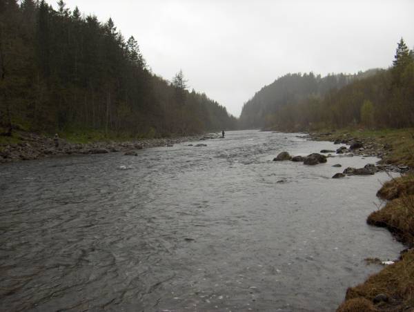 Vannføringen er fin og vanntemperatur er 8 grader. Laks hopper ved utløpet, klar til å gå opp. Det er et kjempegodt tegn. Været er grått, med tunge skyer og regn.