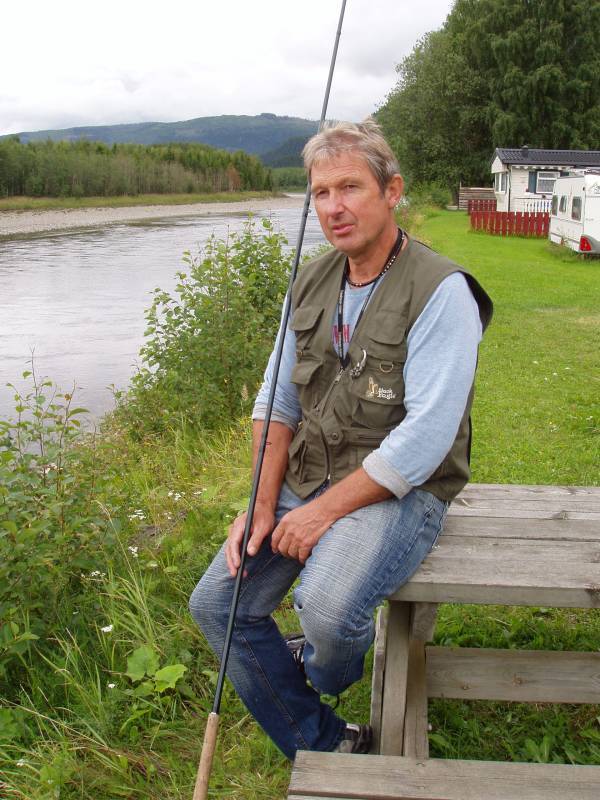 Fiskeguidens medarbeider møter Ola M.Lerfald mens han er i ferd med å ta farvel med Ronny og Linda Skoglund fra Karlskoga i Sverige etter to ukers fantastisk opphold. Det er gjestenes tredje ferie ved Stjørdalselva og stortrives på Midtkil Camping. Først i år fikk han sin første laks på 4,8 kilo, tatt på en oransje tubeflue med krok nr.8. Den ligger godt nedpakket i biklen og skal nytes sammen med gode venner til vinteren
