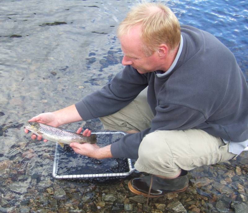 Statkraft har nå satt ut 450 stor ørret i Totak i et femårsprosjekt for å skape et større beitepress og øke snittvekten på massene av smårøye, samtidig som innsjøen blir mer attraktiv for sportsfiske, sier prosjektleder Jostein Kristiansen til Fiskeguiden. Her er Sivert Graasvold fra Rauland i ferd med å sette ut treåringer fra anlegget til Grenland Sportsfiskere. Foto: Tor Aschjem.
